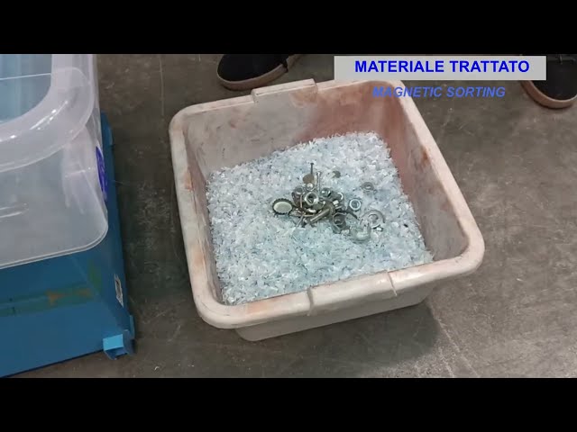 Il materiale inerte cadrà per gravità nella prima bocca di scarico mentre il materiale ferroso trascinato dal campo magnetico verrà poi rilasciato nella seguente bocca di scarico dedicata.
