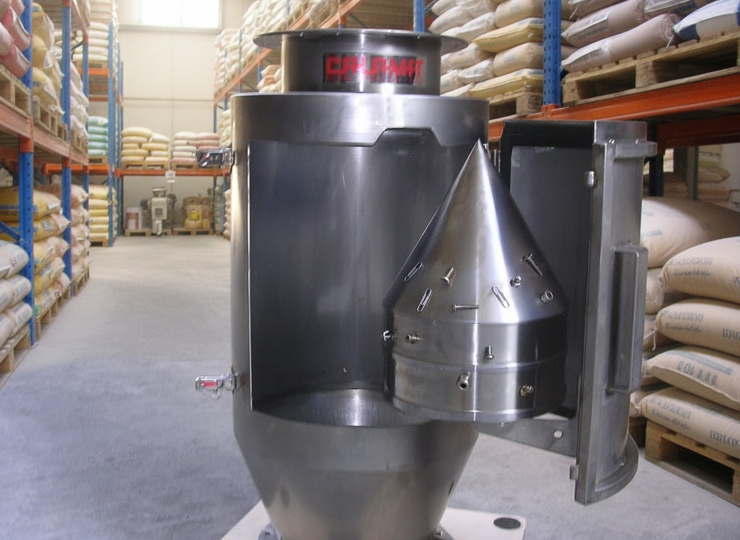 Se si necessita di un sistema automatico di pulizia, realizziamo deferrizzatori tipo DMC con il nucleo elettromagnetico. Tale sistema permette di disinserire il campo magnetico in modo da rilasciare a comando il materiale ferroso catturato, il quale può eventualmente essere scartato da una valvola meccanica di deviazione flusso posta al di sotto del magnete, attuata da un pistone pneumatico, il tutto controllato da un apposito quadro di comando.